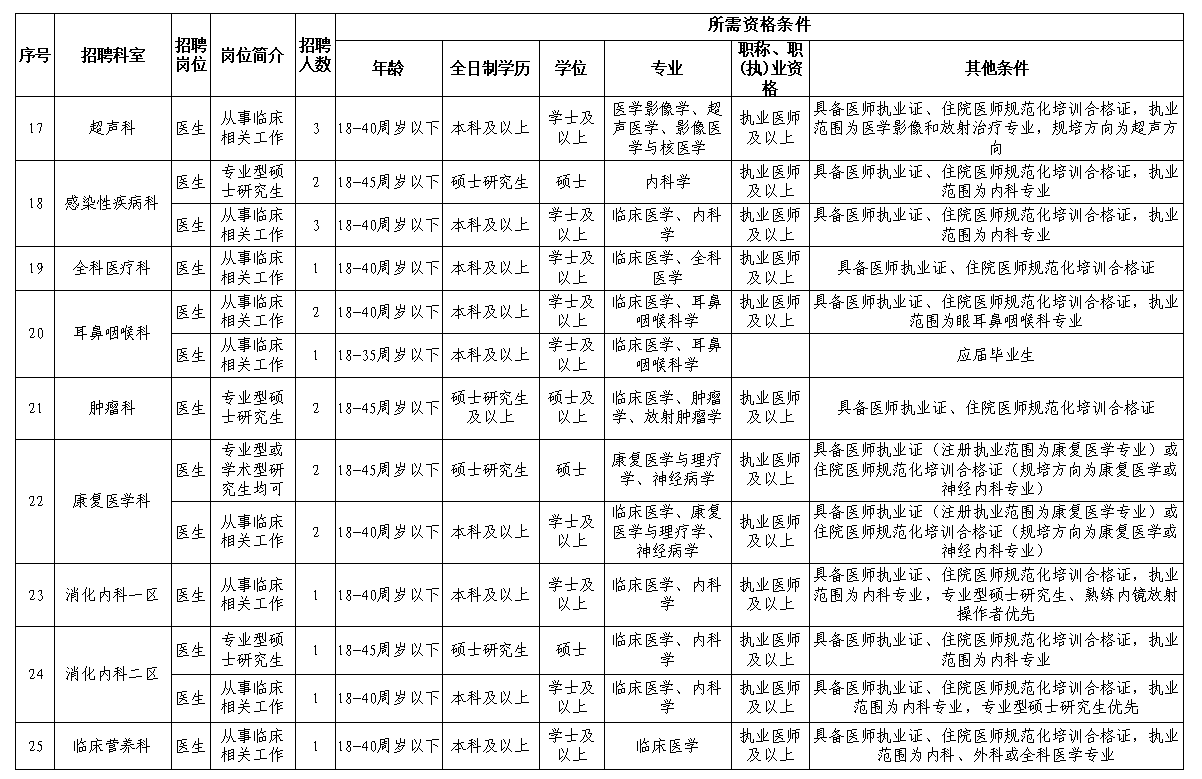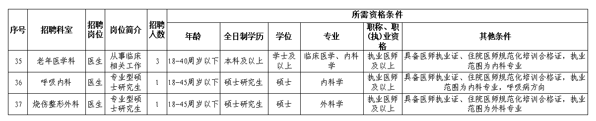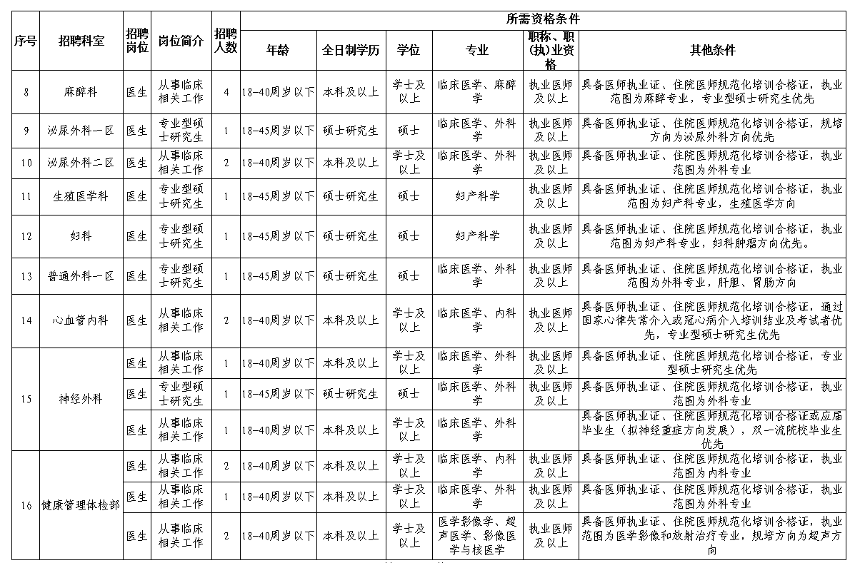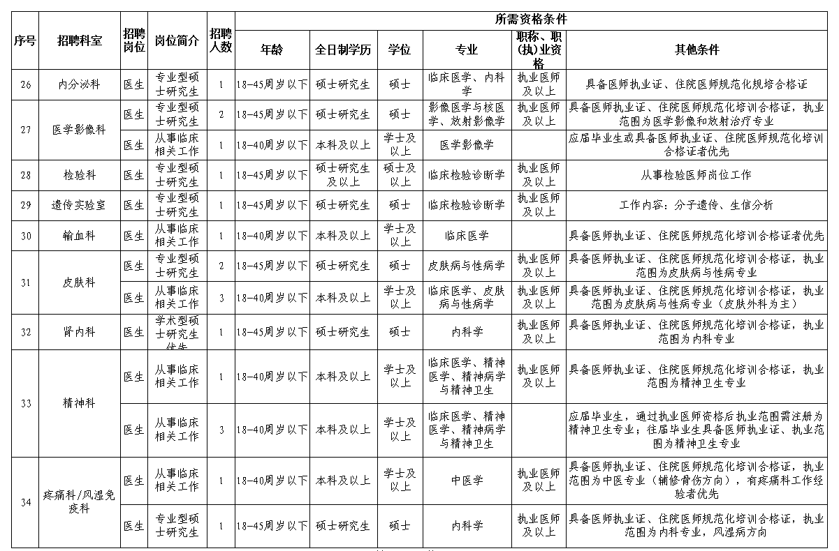 二 招聘基本条件 (一)具有中华人民共和国国籍; (二)遵守中华人民共和国宪法和法律。具有良好的思想政治素质,政治立场坚定,有较强的事业心和责任心,严谨求实、爱岗敬业,具有良好的职业道德; (三)具有岗位所需要的学历学位、年龄、专业(技能)、心理素质、工作经历等要求; (四)符合岗位要求的身体条件及其他相应条件; (五)有下列情形之一者不予聘用: 1.现役军人; 2.曾因犯罪受过刑事处罚的人员; 3.被原单位开除(或辞退)的人员; 4.在各级公务员和事业单位工作人员招考中被认定有作弊行为在规定期限内不得报考的人员; 5.曾被单位处分未满三年的人员; 6.在原单位工作期间发生医疗事故未满三年的人员(以鉴定书为准); 7.在原单位工作期间发生医疗纠纷、医疗事故、医疗争议等导致法律诉讼尚未结案的人员; 8.尚未解除党纪、政纪处分或正在接受审查的人员;涉嫌违法犯罪正在接受司法调查尚未做出结论的人员; 9.社会征信失信人员,其他法律法规规定不得报考的人员。 (六)完成住培时间及取得相应学历学位时间须在2026年8月前(其中住院医师规范化培训合格证必须在入职前或2026年度国家组织的首次考试取得,学术型硕士研究生除外)。 (七)应聘护理岗位者必须在2026年度或之前通过护士执业资格考试。