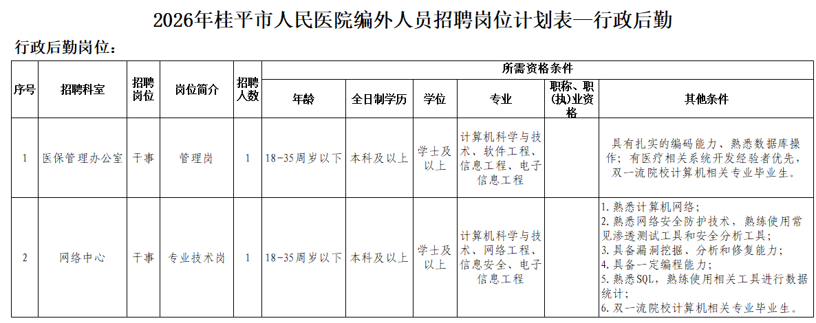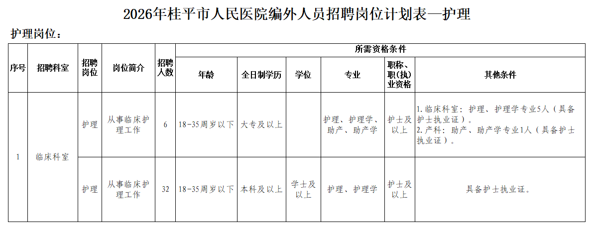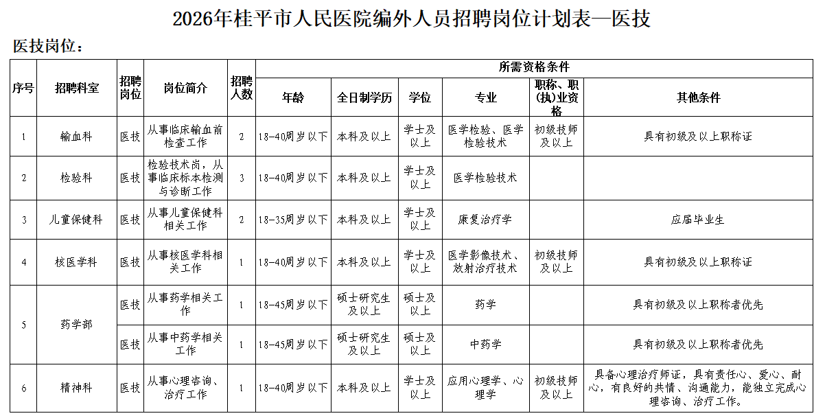 三 岗位需求 青年领军人才、青年骨干人才、业务骨干人才详见附件《2026年桂平市人民医院编外人员招聘岗位计划表》。