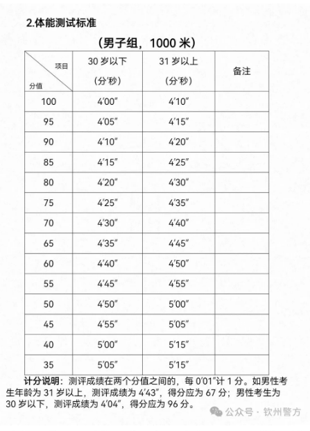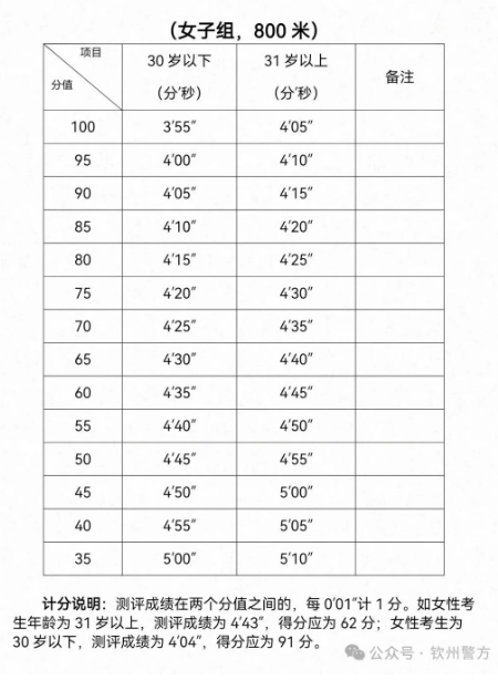 二、招聘条件 (一)具有中华人民共和国国籍。 (二)拥护中华人民共和国宪法,拥护中国共产党的领导,遵纪守法,品行端正。 (三)年龄为18至35周岁,即1991年3月1日至2008年3月31日期间出生。 (四)高中(含中专)以上学历。 (五)身心健康,具有正常履行招聘岗位职责所需的身体条件。裸眼视力均在0.6(标准对数视力4.8)以上,或矫正视力均在0.8(标准对数视力4.9)以上且单眼近视度数不得超过600度;男性身高不低于1.60米,女性身高不低于1.55米;有纹身者不予聘用。 (六)服从工作岗位分配。 (七)符合所报考岗位的具体要求(详见《职位表》)和公安机关规定的其他条件。 (八)具有下列情形之一的,不得报名: 1.本人或者家庭成员、主要社会关系人参加非法组织、邪教组织或者从事其他危害国家安全活动的; 2.本人家庭成员或者主要社会关系人正在服刑或正在接受调查的; 3.受过刑事处罚或涉嫌违法犯罪尚未查清的; 4.编造、散布有损国家声誉、反对党的理论和路线方针政策、违反国家法律法规信息的; 5.因吸毒、嫖娼、赌博等受到处罚的,或因酒驾被处罚过的; 6.被行政拘留、司法拘留或收容教育的; 7.被吊销律师、公证员、教师及其他行业的执业资格证书的; 8.曾因违规违纪违法被开除公职、党籍、军籍,或因违规违纪违法被辞退、解聘(解除或终止劳动合同关系)的; 9.有较为严重的个人不良信用记录的; 10.现为本市各级公安机关在岗辅警的; 11.从钦州市公安机关辅警岗位辞职未超过12个月的; 12.其他不适宜从事警务辅助工作的情形。 三、招聘流程 (一)报名及资格审查 1.报名时间:2026年3月12日00:00至3月21日24:00(共10天)。报名截止后,3月22日、23日为后台审核时间,已注册考生仍可修改资料,但报名系统不再接受新的注册和报名。 2.报名方式:网上报名。考生在报名时间内登录指定网址进行网上报名,填写《钦州市公安局招聘警务辅助人员报名表》并上传报名所需材料。报名网址链接和二维码见附件。 3.报名材料 (1)报名材料包括: ①本人户口簿,要求:地址页(即第一页),本人页。 ②本人身份证,要求:正、反两面。 ③毕业证书,要求:有证书编号,有本人照片及毕业信息。 ④本人照片,要求:近期一寸免冠彩色证件照。 ⑤退役军人要提供退伍证,要求:有证件编号,本人照片及入伍、退伍相关信息。 ⑥符合加分条件的证明材料。 (2)上传材料要求。上传材料必须为原件,材料上的字迹和图片应当清晰可辨。上传复印件或影印件的,或字迹太过模糊,无法辨认的,均视为材料缺失,将无法通过资格审查。 4.资格审查。审查的内容为考生是否符合招聘条件,是否符合加分条件;考生上传材料是否真实、准确、齐全。 5.审查结果查询。报名后考生可在3-5个工作日后再次通过报名二维码登录对审查结果进行查询,也可在体能测试前通过微信公众号进行查询。 【注意事项】 ①关于网上报名。考生可用电脑打开网址或用手机扫描二维码进行报名。报名后3-5日要再次登录,查询报名结果,资料不齐全或不合格的,系统将有说明和提示,务必及时补交。 ②全程资格审查。在测试考试前,将公布资格审查合格人员名单。应聘资格审查将贯穿招聘全流程,一旦发现考生提供的材料不真实、不准确,或有伪造、假冒、修改的,或有其他不符合从事警务辅助工作情形的,立即取消应聘资格。 ③符合加分条件的,必须在报名时提供相关证明材料,否则不予加分,逾期不再受理。 (二)测试考试 1.体能测试。资格审查合格的考生参加体能测试。体能测试项目为长跑,即男子1000米,女子800米体能测试计算成绩,评分标准附后。 【注意事项】 考生应当根据个人身体状况、自愿参加体能测试;如本人身体状况欠佳、不能参加的,应主动放弃测试。完成体能测试的考生才能进入下一环节考试。 2.笔试。笔试主要考察考生的文化基础知识,刑法、刑事诉讼法、治安管理处罚法、道路交通安全法、广西壮族自治区公安机关警务辅助人员条例等公安机关常用法律知识,党的基本知识,以及当前时事要点等。详见附件《钦州市公安局警务辅助人员应知应会知识》。考试时间为40分钟,满分为100分。 考生具有下列情形之一的,加10分: (1)烈士、因公牺牲公安民警的配偶、子女; (2)退役军人; (3)见义勇为积极分子和先进个人; (4)警察类或政法类院校毕业生。 考生同时符合两种及以上情形的,只加分一次,加分直接计入笔试成绩。 3.面试。采用结构化面试,面试成绩满分为100分。 4.考试综合成绩的计算。考生的综合成绩按体能测试占20%、笔试占35%、面试占45%的比例计算。本次考试成绩在2026年内有效。 5.考试时间和地点:预计报名结束后5—10天将组织开展测试考试。其中,岗位一至岗位三的测试考试,由市公安局政治部负责组织开展;岗位四、岗位五的测试考试,由中马钦州园区公安分局负责组织开展。具体时间、地点及相关事项以正式考试通知为准。正式考试通知,将通过本次招聘专用QQ群和微信公众号“钦州警方”发布。 (三)体检 考试测试结束后,确定分数线,达到分数线以上依据考试综合成绩由高到低排序,按照招聘人数1:1的比例确定进入体检和政审人员名单。 体检安排在钦州市第一人民医院进行,费用由应聘人员承担。体检标准:除身高、视力标准按照本公告外,其他体检内容和指标按照《公务员录用体检通用标准(试行)》执行。 (四)政审