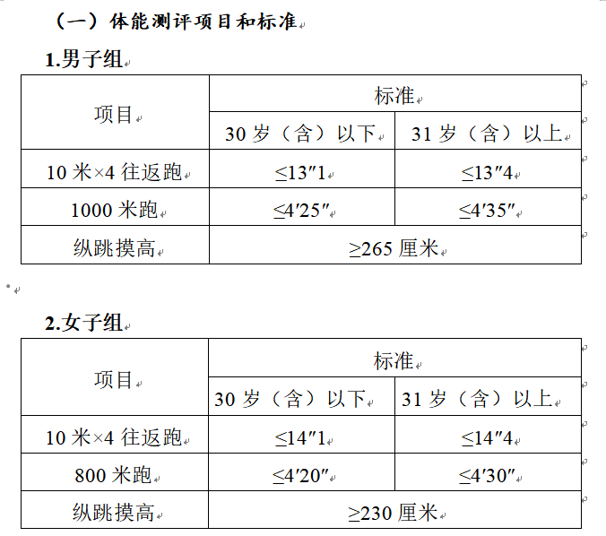 参照《关于印发<公安机关录用人民警察体能测评项目和标准>的通知》(公政治〔2024〕60号)执行,每个测评项目分别记录成绩。其中纵跳摸高的测评次数不超过3次,10米×4往返跑测评次数不超过2次,男子1000米跑、女子800米跑测评次数均为1次。