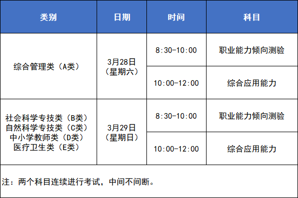 2026年度事业单位统一公开招聘工作人员公共科目笔试将于3月28、29日(本周末)举行。本次公共科目笔试时间按照考试类别有所区分:综合管理类(A类)为3月28日(星期六);社会科学专技类(B类)、自然科学专技类(C类)、中小学教师类(D类)和医疗卫生类(E类)为3月29日(星期日)。
