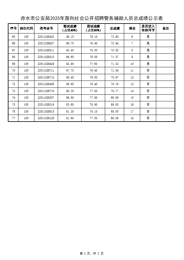 根据《赤水市公安局2025年面向社会公开招聘警务辅助人员公告》规定,笔试、体能测评、面试工作已结束,现将总成绩及是否进入体检环节人员进行公示(详见附件)。如有异议,请在公示期内以书面形式向赤水市纪委、赤水市人力资源和社会保障局、赤水市公安局反映,逾期不再受理。
