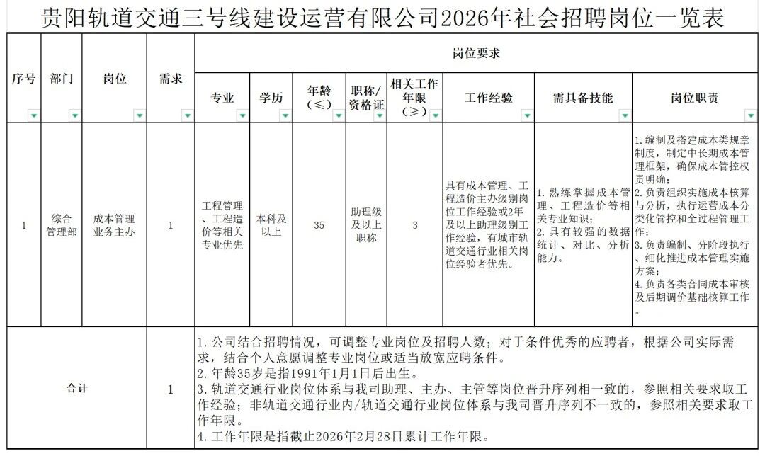 附件1:贵阳轨道交通三号线建设运营有限公司2026年社会招聘岗位一览表.xlsx
