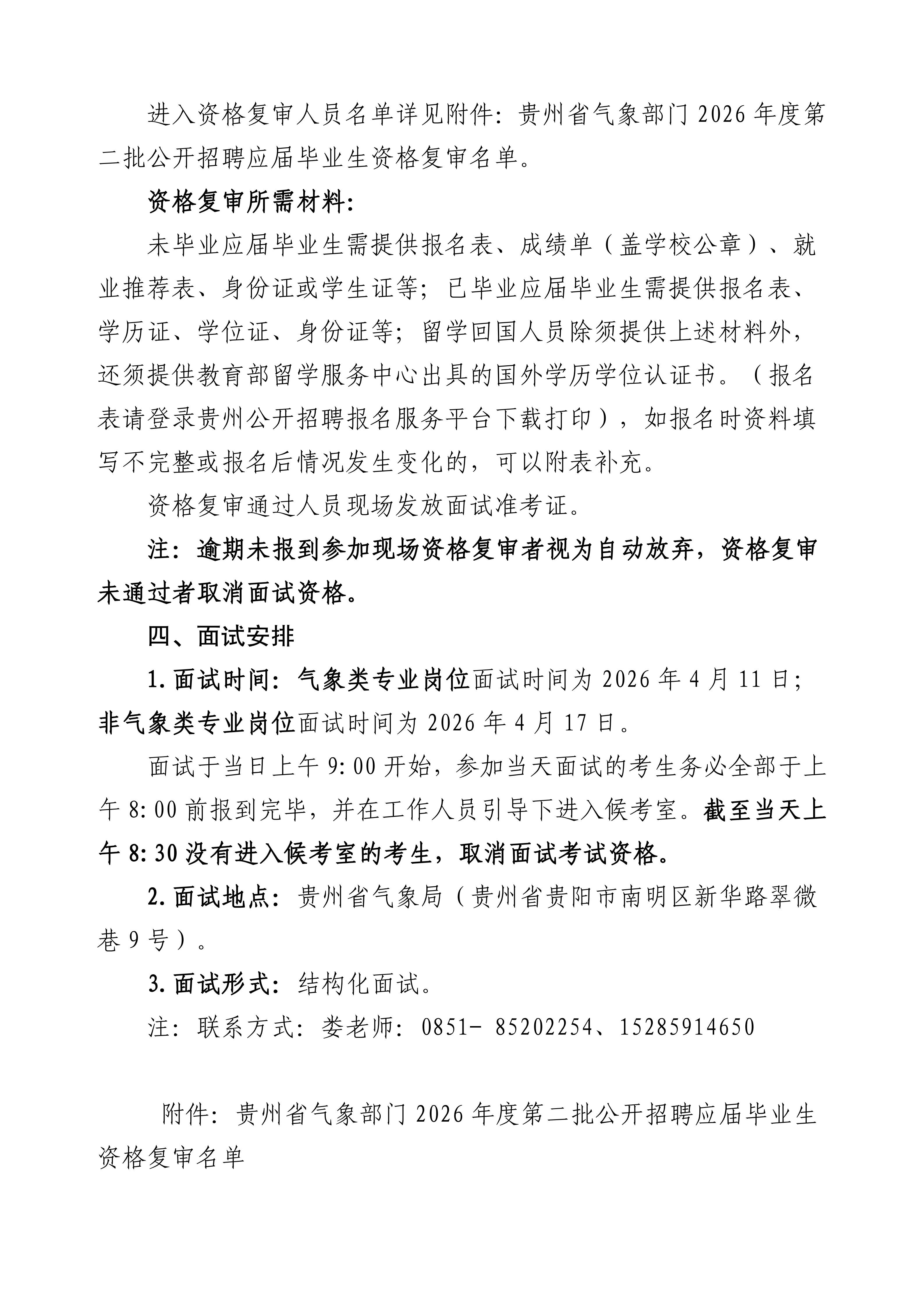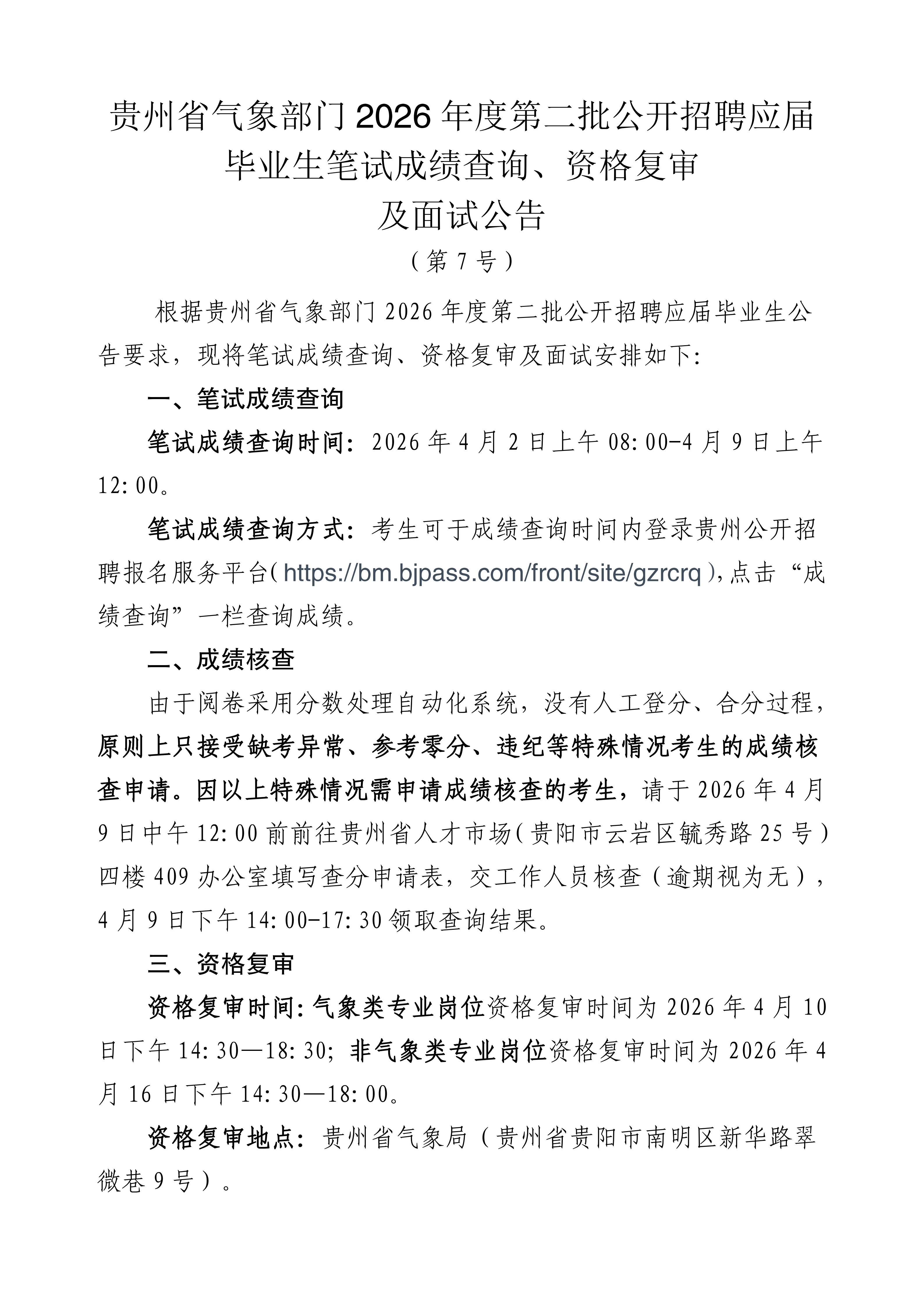 2026年贵州省气象部门第二批招聘应届毕业生笔试成绩查询、资格复审及面试公告