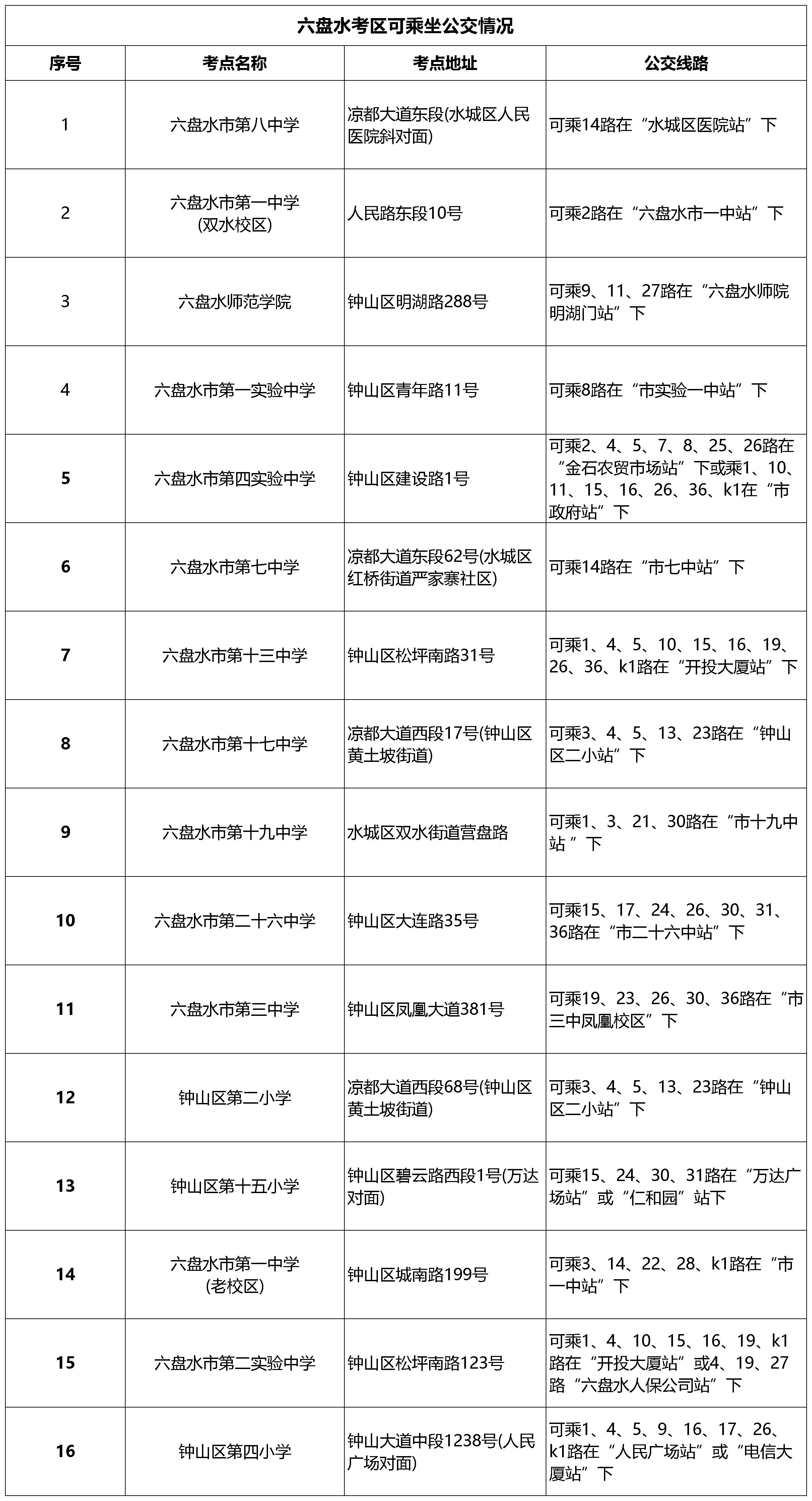 六盘水考区笔试共设16个考点,各考点名称、考点详细地址及到达公交线路如下: