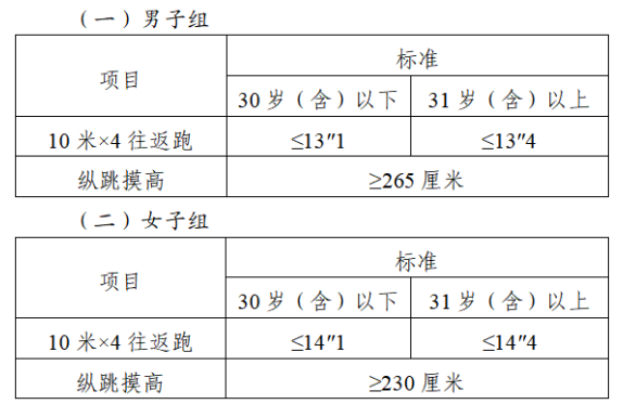备注:10米×4往返跑每人最多可测2次,1次测评达标即视为该项目测评合格;纵跳摸高每人最多可测3次,1次测试达标即视为该项目测试合格。