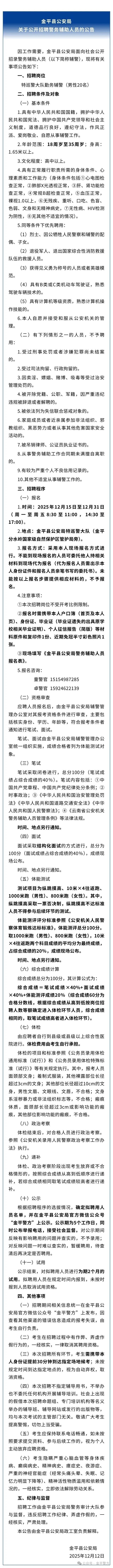 红河州金平公安公开招聘警务辅助人员的公告(20人)