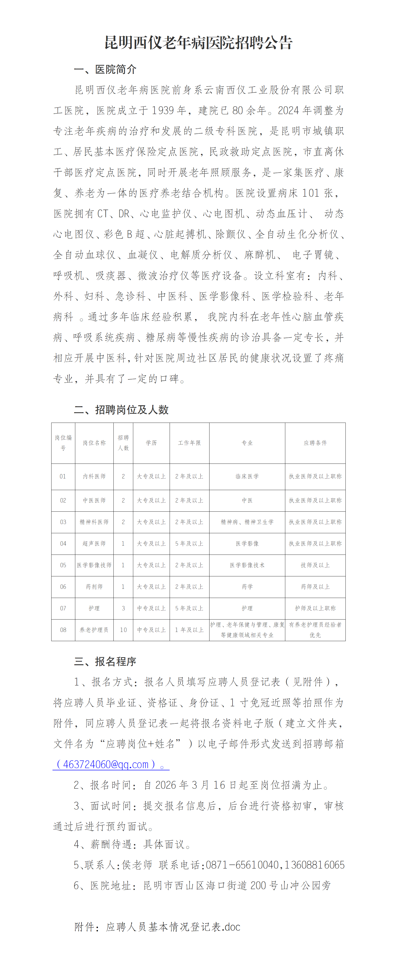 昆明西仪老年病医院招聘公告(22人)