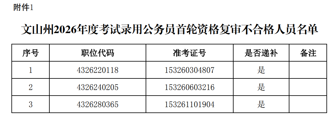 附件:1.文山州2026年度考试录用公务员首轮资格复审不合格人员名单