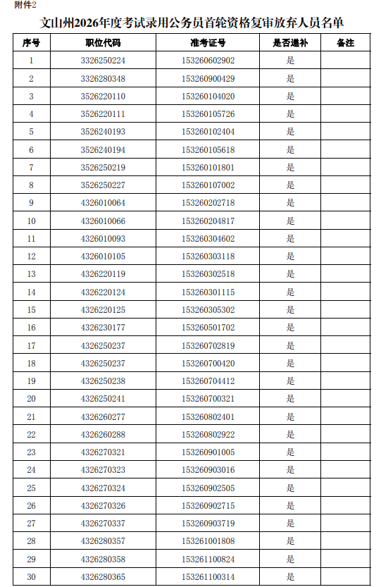 2.文山州2026年度考试录用公务员首轮资格复审放弃人员名单