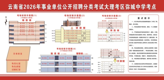 大理州2026年事业单位公开招聘工作人员笔试(弥渡考点)将于3月29日(星期日)上午进行,考点设在弥城镇初级中学,为帮助您做好考前准备,顺利参加考试,现将弥渡考区有关事项提示如下:
